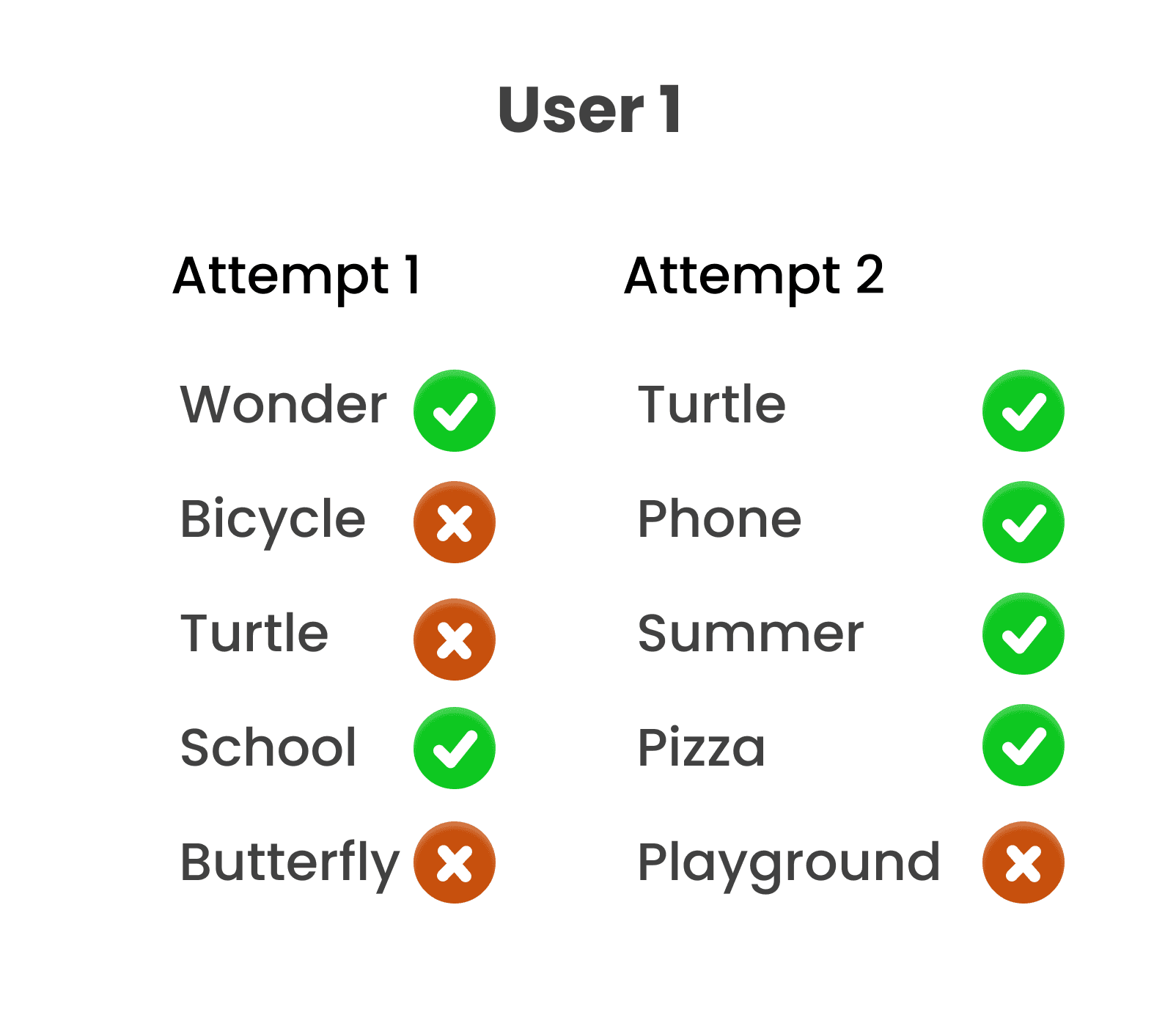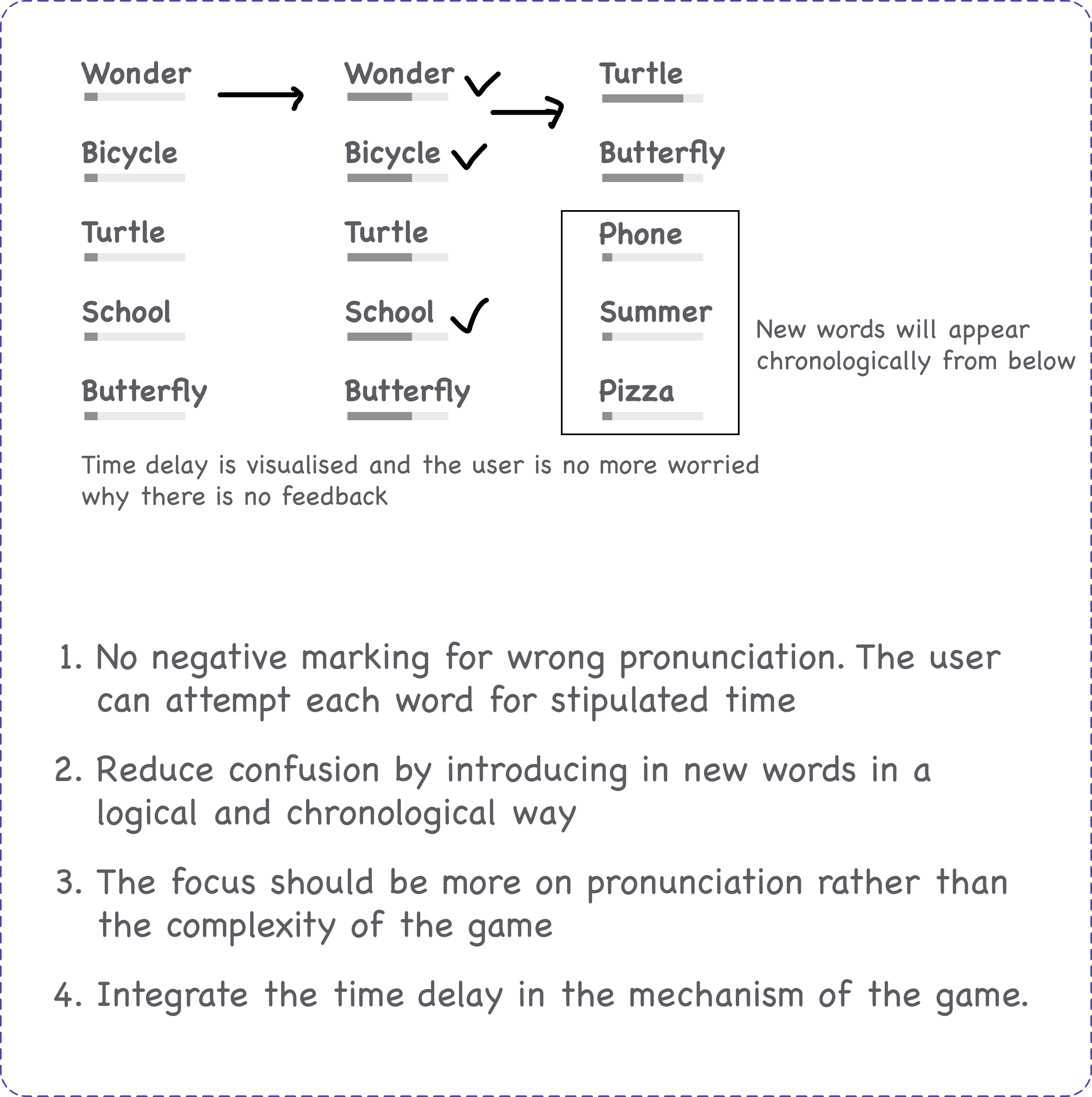 In the interface redesign, I implemented a positive feedback mechanism that provides confirmation when a word is correctly recognised. In cases of incorrect pronunciation, the word remains on the screen for a brief period, allowing the user to make another attempt before disappearing.